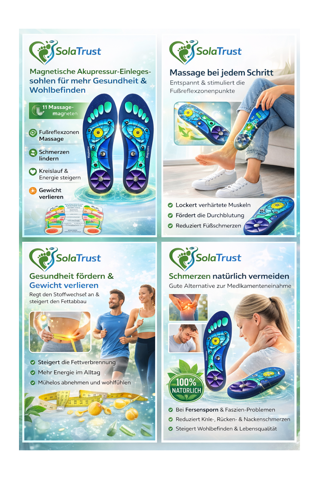 Die SolaTrust Einlagesohlen kombinieren wohltuende Akupressurpunkte mit integrierten Magneten und einer ergonomischen Fuß-Zonen Massage. Bei jedem Schritt entsteht ein angenehmer Massageeffekt, der den Alltag komfortabler und entspannter machen kann. Durch das Atmungsaktive Material sind Sie vor Schweißfüßen und unangenehmen Geruch Geschützt!